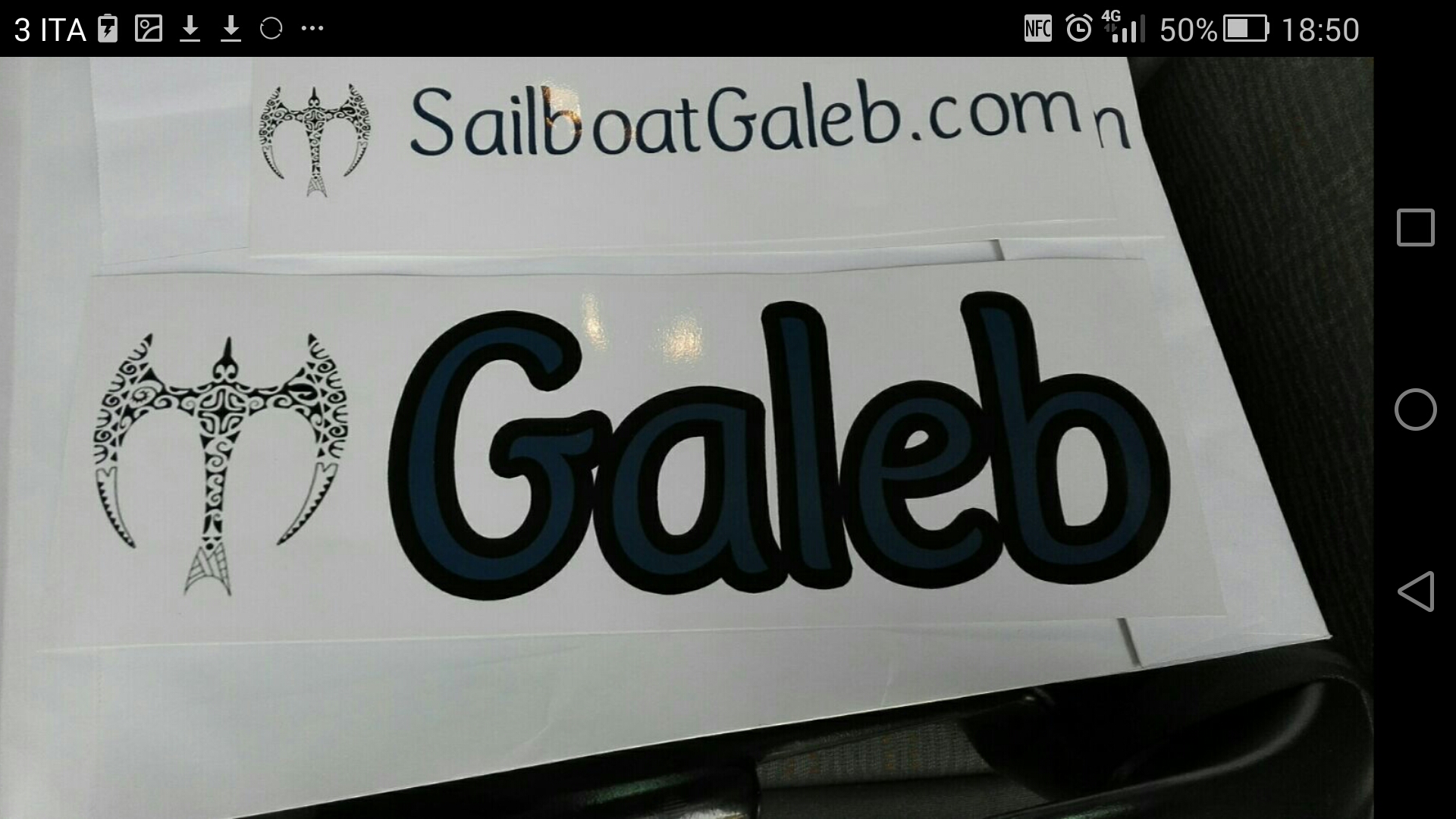 Ho fatto fare l’adesivo per la poppa con il nome della la barca e due piccoli per la prua con il nome del sito a cui tengo tanto (SailboatGaleb.com).