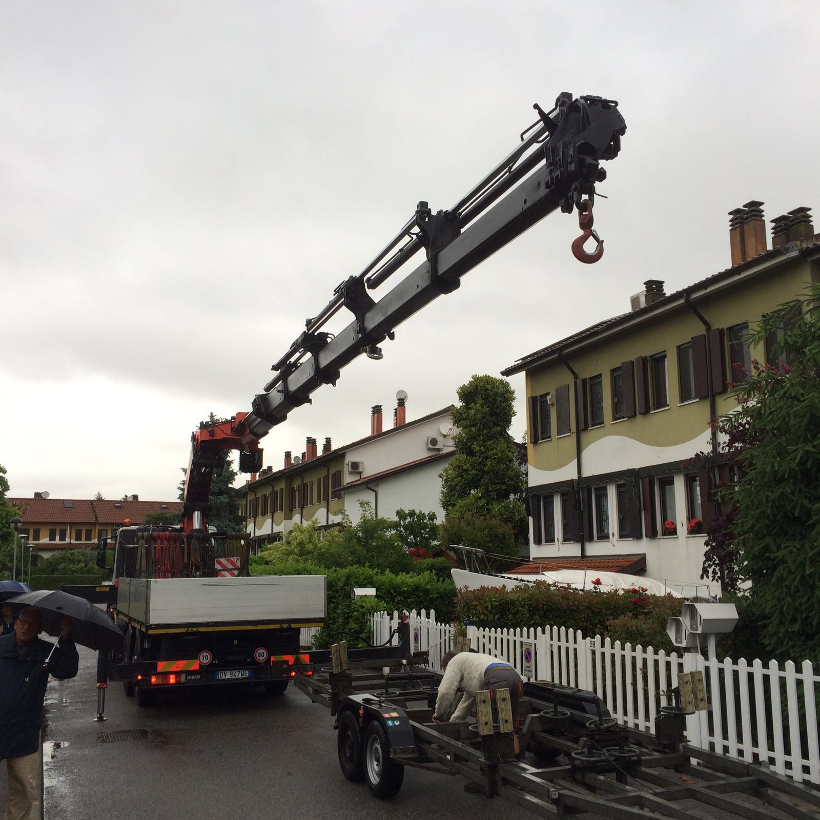 Camion con gru, camion per il trasporto, qualche curioso che si ferma stupito di vedere una barca che viene sollevata dal mio giardino, ma nessuno si lamenta di trovare la strada bloccata.