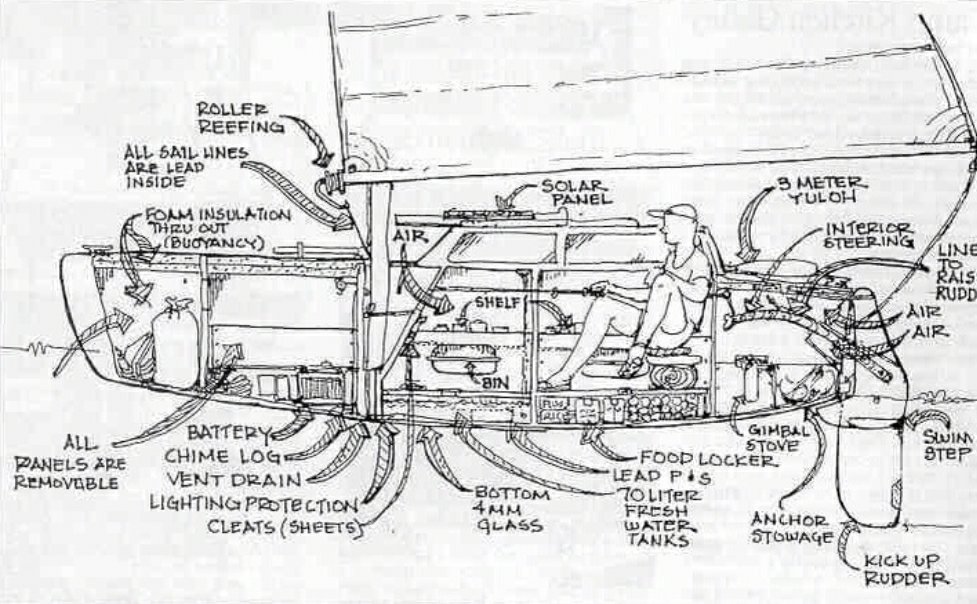 La costruzione potrebbe essere replicata in compensato nautico. L’attrezzatura copiata da quella in uso sui modelli che stanno navigando : un buon pannello solare per l’autonomia energetica, a cui aggiungere un piccolo motore elettrico da utilizzare per le manovre in porto oltre che al remo che molto più semplicemente garantirà sempre il funzionamento. Per l’attrezzatura velica si potrebbe arretrare l’albero (anche pensando di farlo bipode) e utilizzare solo un fiocco rollato a prua, come sulle barche di Tross.
